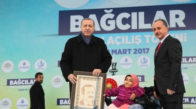 Konuşmaların ardından Bağcılar Belediyesi Engelliler Sarayı kursiyeri şair Senem Ünal, Cumhurbaşkanı Recep Tayyip Erdoğan’a kendi elleriyle yaptığı ahşap yakma resmini hediye etti. Daha sonra Cumhurbaşkanı Erdoğan, Topbaş, Enerji ve Tabii Kaynaklar Bakanı Berat Albayrak, AK Parti İstanbul Milletvekilleri Feyzullah Kıyıklık, Harun Karaca, Tülay Kaynarca ile İstanbul Valisi Vasip Şahin ve Bağcılar Belediye Başkanı Lokman Çağırıcı birlikte kurdeleyi keserek 36 tesisin resmi açılışını gerçekleştirdi.