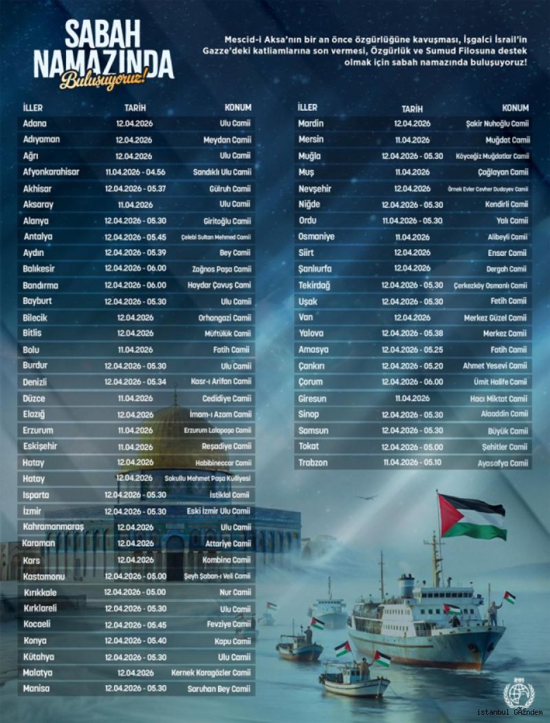 Adana – 12.04.2026 – Ulu CamiiAdıyaman – 12.04.2026 – Meydan CamiiAğrı – 12.04.2026 – Ulu CamiiAfyonkarahisar – 11.04.2026 – 04.56 – Sandıklı Ulu CamiiAkhisar – 12.04.2026 – 05.37 – Gülruh CamiiAksaray – 11.04.2026 – Ulu CamiiAlanya – 12.04.2026 – 05.30 – Giritoğlu CamiiAntalya – 12.04.2026 – 05.45 – Çelebi Sultan Mehmet CamiiAydın – 12.04.2026 – 05.39 – Bey CamiiBalıkesir – 12.04.2026 – 06.00 – Zağnos Paşa CamiiBandırma – 12.04.2026 – 06.00 – Haydar Çavuş CamiiBayburt – 12.04.2026 – 05.30 – Ulu CamiiBilecik – 12.04.2026 – Orhangazi CamiiBitlis – 12.04.2026 – Müftülük CamiiBolu – 11.04.2026 – Fatih CamiiBurdur – 12.04.2026 – 05.30 – Ulu CamiiDenizli – 12.04.2026 – 05.34 – Kasr-ı Arifan CamiiDüzce – 11.04.2026 – Cedidiye CamiiElazığ – 12.04.2026 – İmam-ı Azam CamiiErzurum – 11.04.2026 – Erzurum Lala Paşa CamiiEskişehir – 11.04.2026 – Reşadiye CamiiHatay – 12.04.2026 – Habib-i Neccar CamiiHatay – 12.04.2026 – Sokullu Mehmet Paşa KülliyesiIsparta – 12.04.2026 – 05.30 – İstiklal Camiiİzmir – 12.04.2026 – 05.30 – Eski İzmir Ulu CamiiKahramanmaraş – 12.04.2026 – Ulu CamiiKaraman – 12.04.2026 – Attariye CamiiKars – 12.04.2026 – Kombina CamiiKastamonu – 12.04.2026 – 05.00 – Şeyh Şaban-ı Veli CamiiKırıkkale – 12.04.2026 – 05.00 – Nur CamiiKırklareli – 12.04.2026 – 05.30 – Ulu CamiiKocaeli – 12.04.2026 – 05.45 – Fevziye CamiiKonya – 12.04.2026 – 05.40 – Kapu CamiiKütahya – 12.04.2026 – 05.30 – Ulu CamiiMalatya – 12.04.2026 – Kernek Karagözler CamiiManisa – 12.04.2026 – 05.30 – Saruhan Bey CamiiMardin – 12.04.2026 – Şakir Nuhoğlu CamiiMersin – 11.04.2026 – Muğdat CamiiMuğla – 12.04.2026 – 05.30 – Köyceğiz Müftülük CamiiMuş – 11.04.2026 – Çağlayan CamiiNevşehir – 12.04.2026 – Örnek Evler Cevher Dudayev CamiiNiğde – 12.04.2026 – 05.30 – Kendirli CamiiOrdu – 11.04.2026 – 05.30 – Yalı CamiiOsmaniye – 11.04.2026 – Alibeyli CamiiSiirt – 12.04.2026 – Ensar CamiiŞanlıurfa – 12.04.2026 – Dergah CamiiTekirdağ – 12.04.2026 – 05.30 – Çerkezköy Osmanlı CamiiUşak – 12.04.2026 – 05.30 – Fetih CamiiVan – 12.04.2026 – Merkez Güzel CamiiYalova – 12.04.2026 – 05.38 – Merkez CamiiAmasya – 12.04.2026 – 05.25 – Fatih CamiiÇankırı – 12.04.2026 – 05.20 – Ahmet Yesevi CamiiÇorum – 12.04.2026 – 06.00 – Ümit Halife CamiiGiresun – 11.04.2026 – Hacı Miktat CamiiSinop – 12.04.2026 – 05.30 – Alaaddin CamiiSamsun – 12.04.2026 – 05.30 – Büyük CamiiTokat – 12.04.2026 – 05.00 – Şehitler CamiiTrabzon – 11.04.2026 – 05.10 – Ayasofya Camii